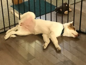 Don’t let this goofiness foul you. Yes she is goofy but sleeping isn’t something she likes to do!! LOL. We have a Penny pen for her and I must say it’s pretty sweet space in the house but Penny does not agree. She doesn’t like to stay in there by herself. We are trying to get her to nap in there on her own and that has been a long process. She is pretty much beside me when I am in the kitchen but she will not stay in there without barking and she has a high pitched bark. I didn’t think deaf dogs would bark that much but she sure does.